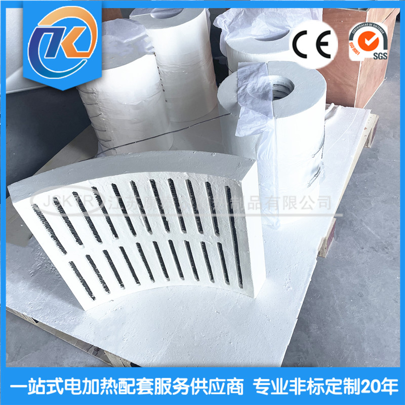陶瓷纖維模塊系列: (1) 材料:1260,1400,1430度陶瓷纖維,其長(zhǎng)期使用溫度再500-1200度。 (2)鑲嵌形式:電阻絲外露式,電阻絲微露式,電阻絲埋入式。 (3)加熱元件:瑞典kanthal系列合金等,具體可以根據(jù)實(shí)際使用溫度和客戶要求來進(jìn)行配置。 (4)規(guī)格,使用溫度和材料均可按照要求定制;高溫穩(wěn)定,抗熱震,抗腐蝕,低熱容,低導(dǎo)熱率。