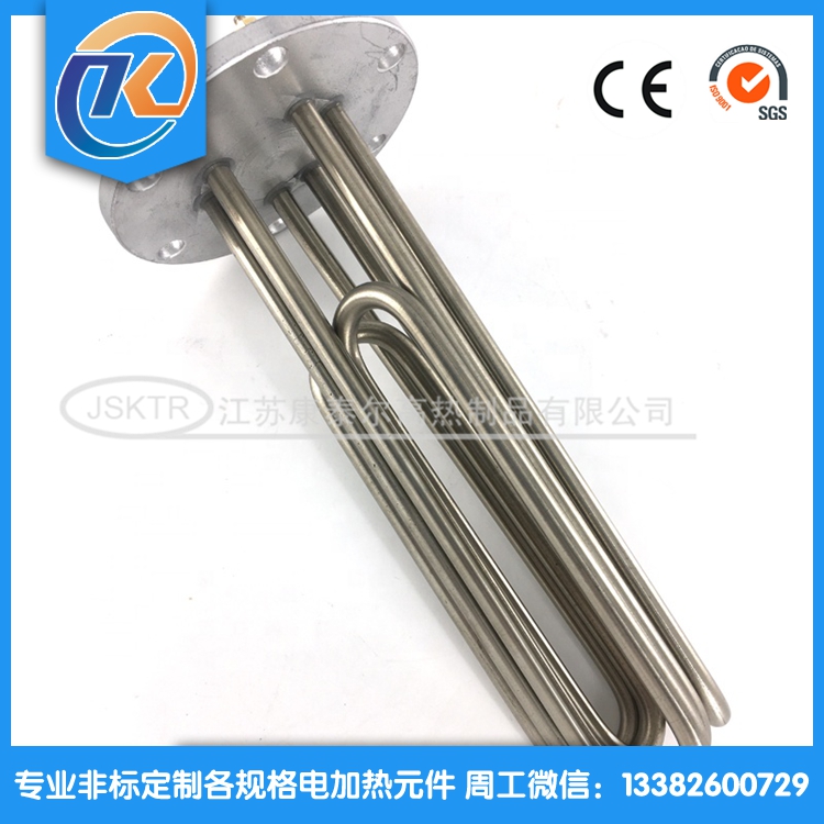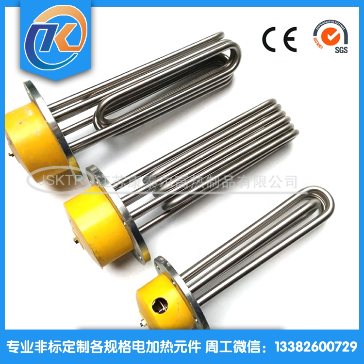 法蘭電加熱管(也稱插入式電加熱器):是采用U型電熱管,依據(jù)加熱的空氣或者水油等來(lái)設(shè)計(jì),按照功率配置要求裝配在法蘭蓋上,插入需加熱物料中,當(dāng)介質(zhì)溫度達(dá)到工藝要求時(shí),持續(xù)保持加熱;而當(dāng)發(fā)熱元件超溫或低液位時(shí),發(fā)熱元件的聯(lián)鎖保護(hù)裝置立即切斷加熱電源避免發(fā)熱元件燒壞,延長(zhǎng)使用壽命。 應(yīng)用范圍 法蘭電熱管訂購(gòu)參數(shù): 1.電壓,功率; 2.材質(zhì); 3.管徑; 4.長(zhǎng)度; 5.數(shù)量; 6.加熱什么,長(zhǎng)期溫度多少; 7.加熱管類(lèi)型;